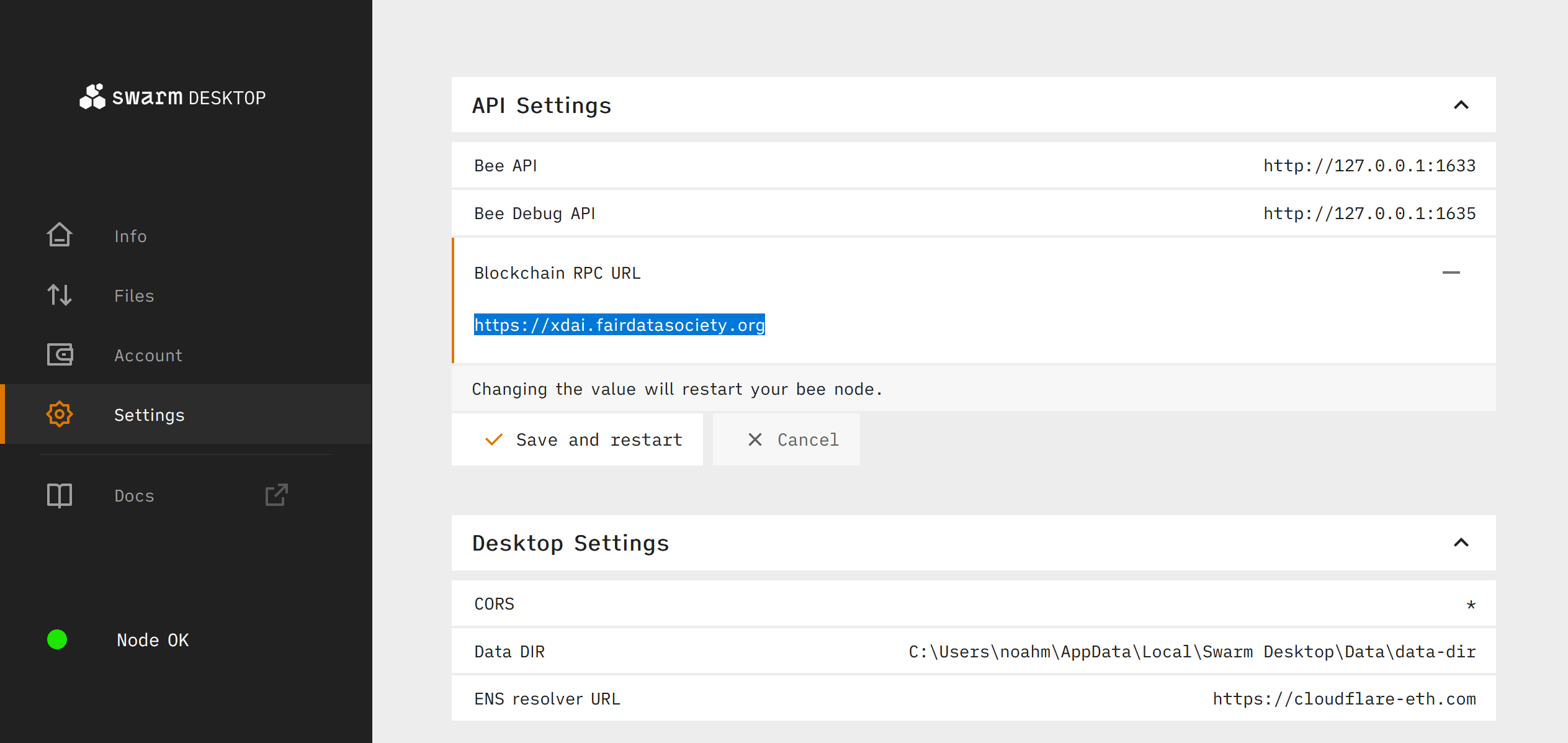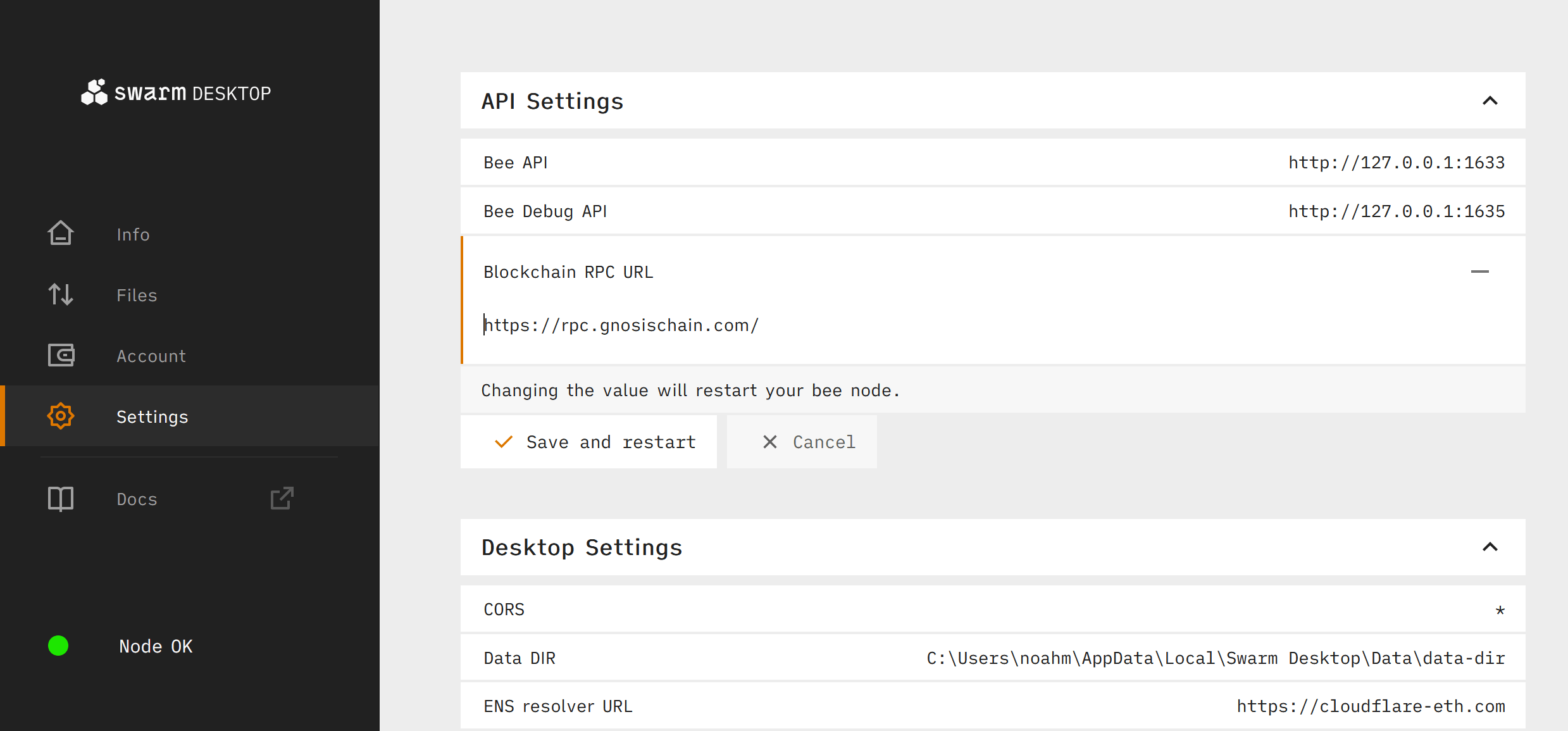 From the Settings tab, expand the API Settings section and click the pen button next to Blockchain RPC URL to edit the default RPC. You can choose any valid Gnosis Chain RPC, either from your own Gnosis node or a service provider. You can find a list of paid and free RPC options from the Gnosis Chain docs. For this example we will use the free endpoint - https://rpc.gnosischain.com/.