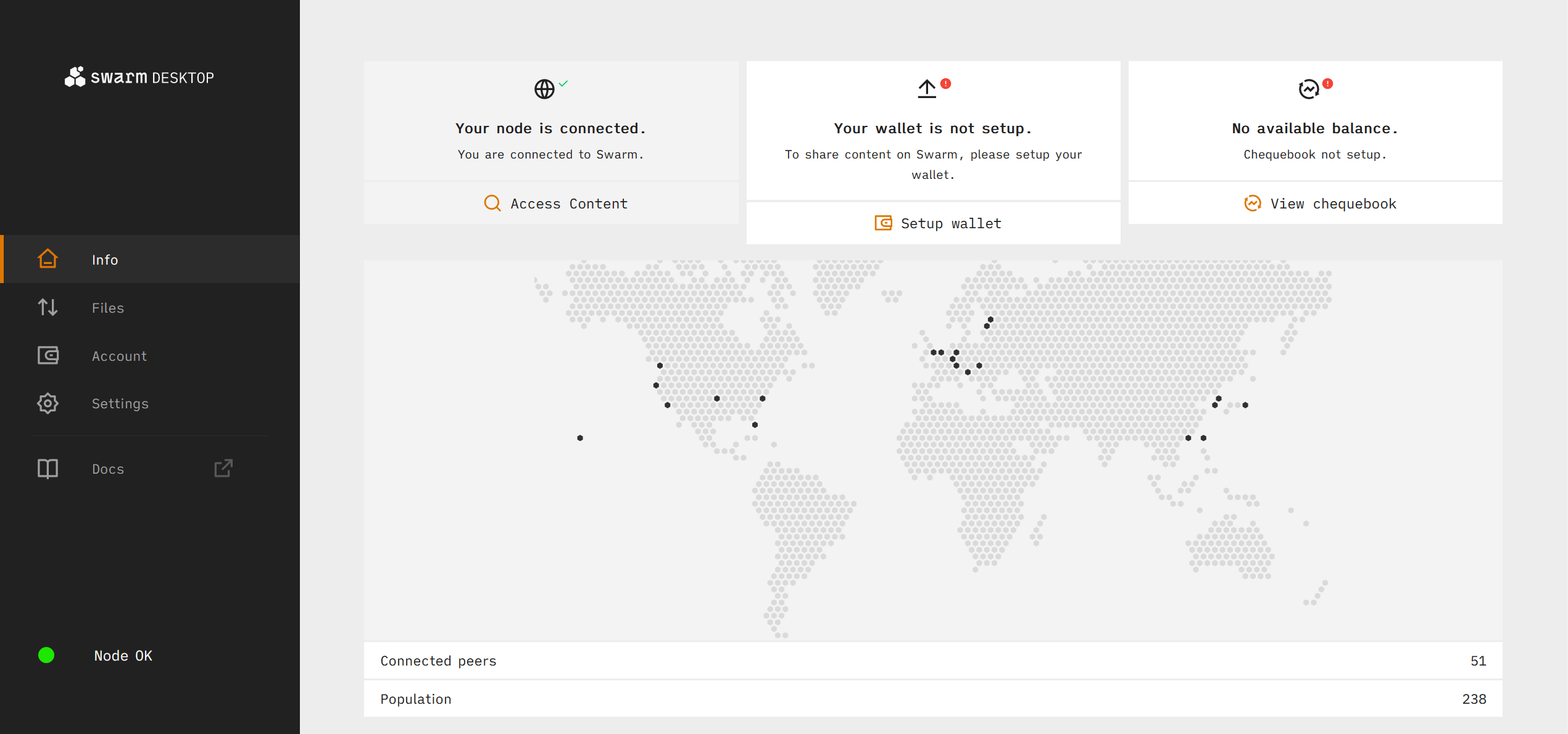 Bee ultra-light nodes are limited to only downloading small amounts of data from Swarm. In order to download greater amounts of data or to upload data to Swarm you must upgrade to a light node. To do this we need to first fund our Swarm Desktop Bee node with some xDAI (DAI bridged from Ethereum to Gnosis Chain which serves as Gnosis Chain's native token for paying transaction fees) in order to pay for the Gnosis Chain transactions required for setting up a light node.