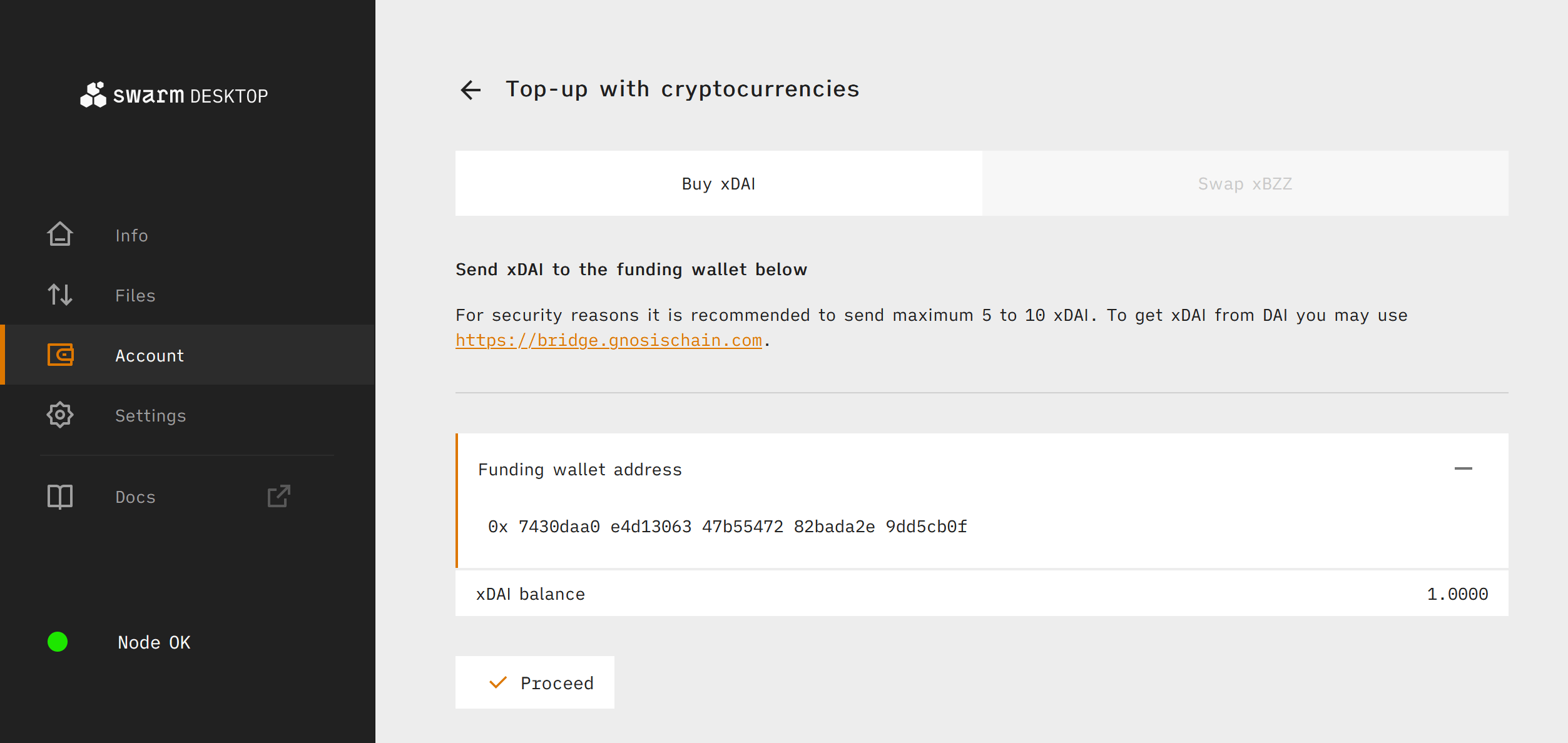 Once you have a few xDAI in your Gnosis Chain address, to fund your Bee node you need to send it from your wallet to your Swarm Desktop wallet. You can find your address from the Account tab of the app.