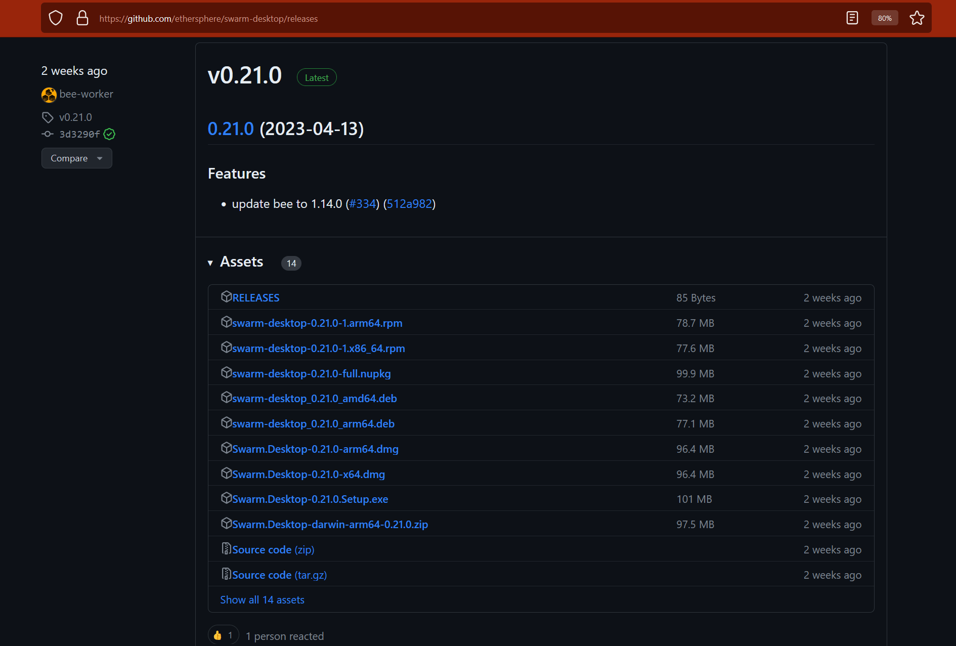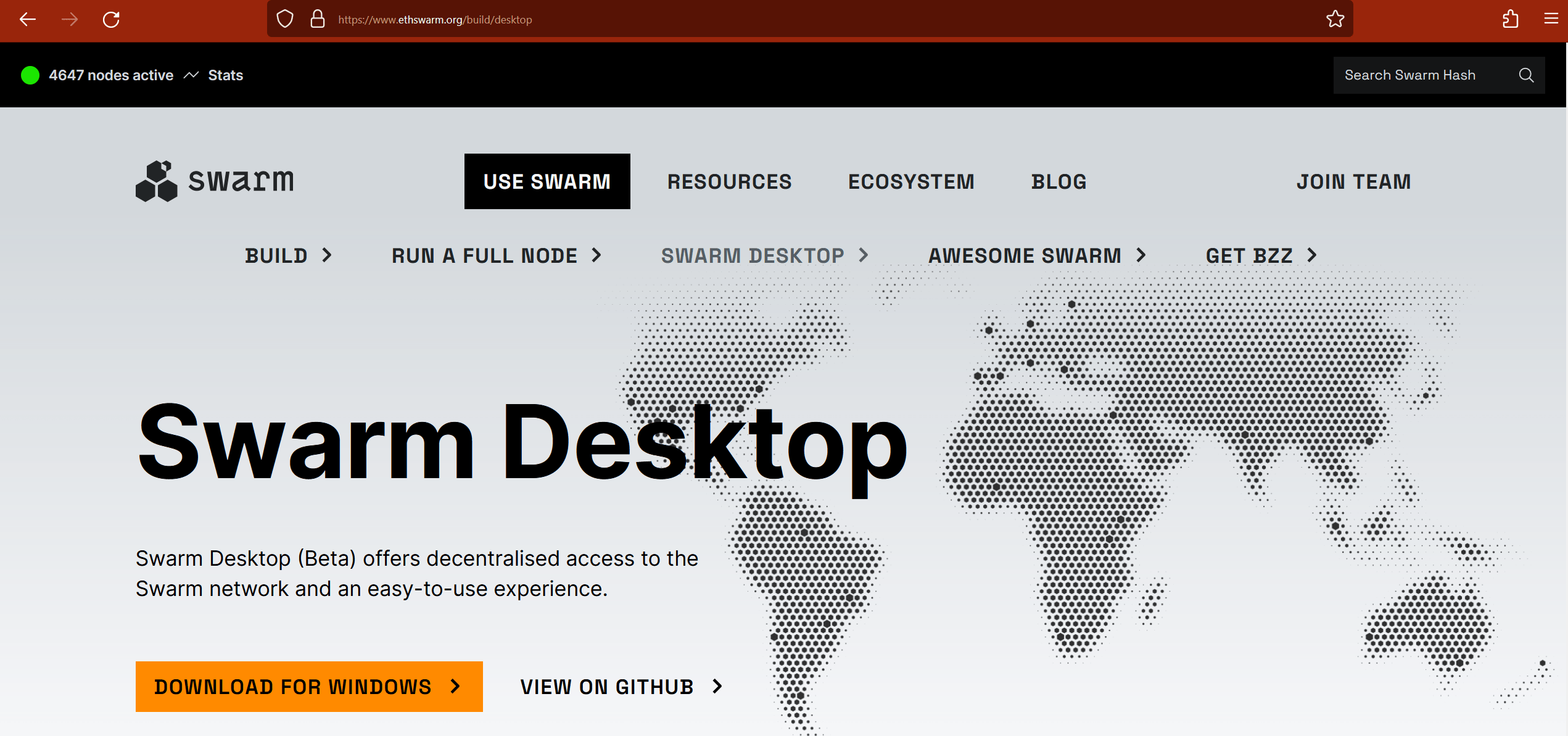 Installing the Swarm Desktop app takes only a few clicks. To get started, simply download and install the Swarm Desktop app for your operating system. Installers are available for Windows, Linux, and OSX. You can find download links for Swarm Desktop at the Swarm homepage and you can find installers for specific operating systems at the releases page of the Swarm Desktop GitHub repo.