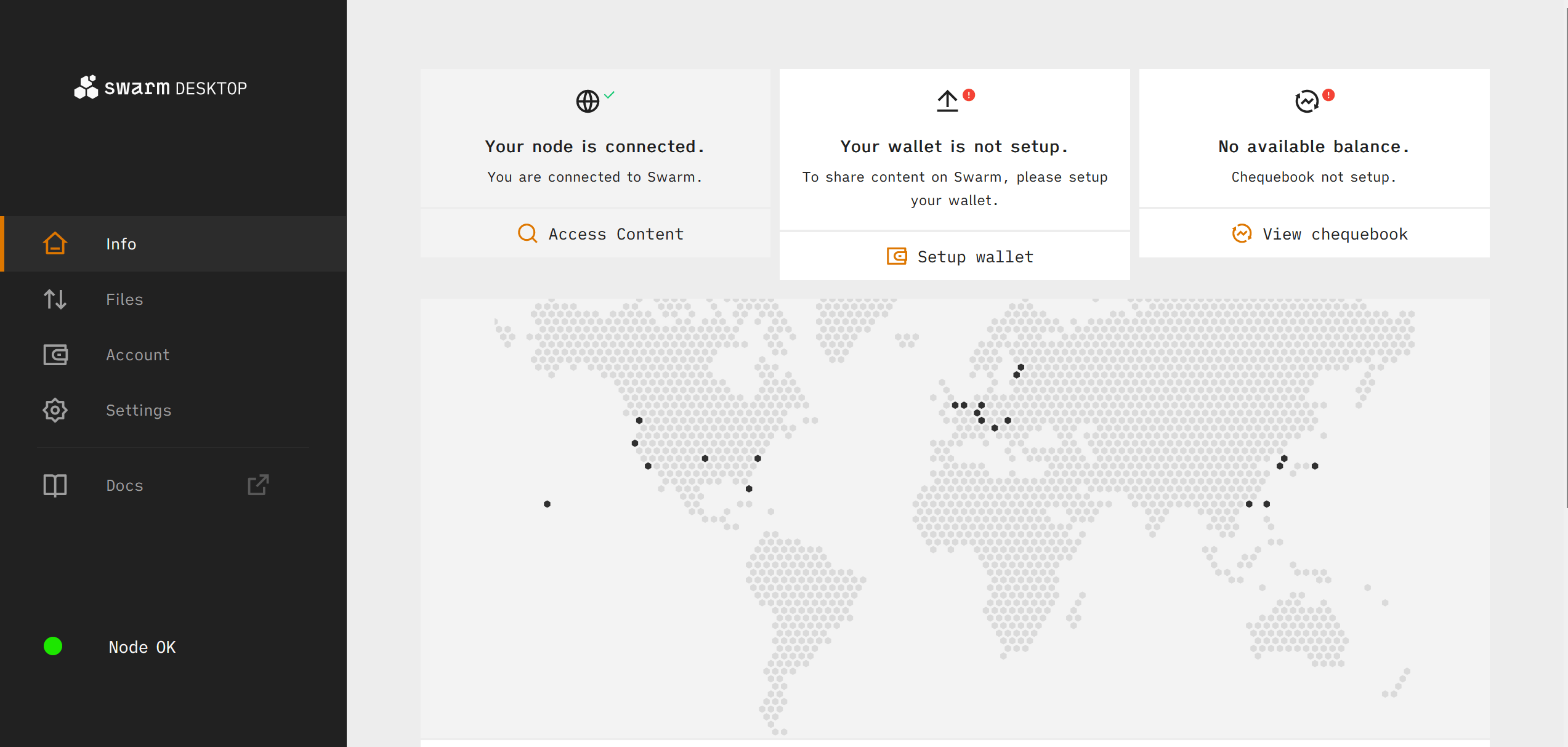 The "Info" tab gives you a quick view of your Swarm Desktop's status. From here we can quickly see if the node is connected to Swarm, whether the node is funded, and whether its chequebook contract is set up. On a new install of Swarm Desktop, the node should be connected, but the wallet and chequebook will not have been set up yet.