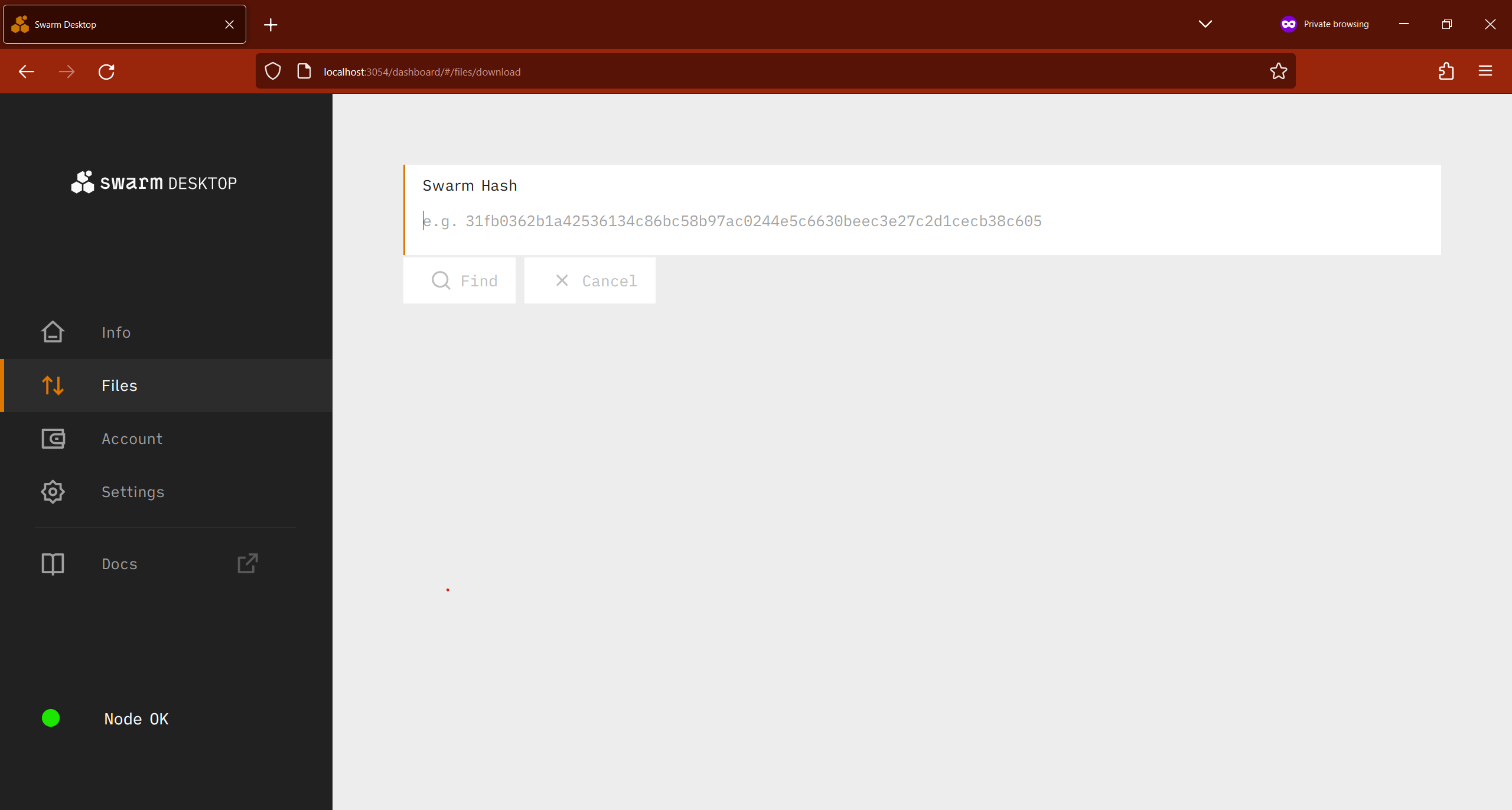 Once the installation is complete, Swarm Desktop will open up in your default browser in a new window to the "Info" tab of the app:
